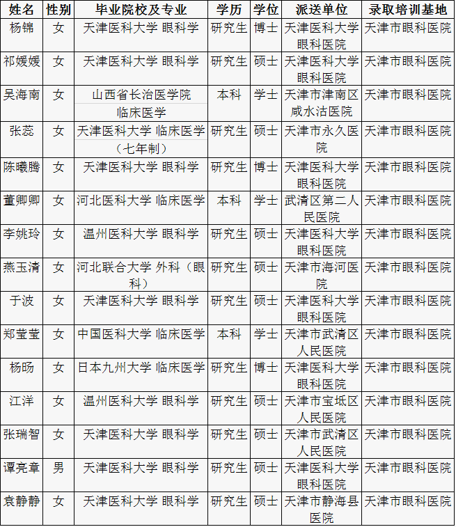 天津市眼科医院2015年住院医师规范化培训学员招录工作结束,现将招录名单公示如下:
