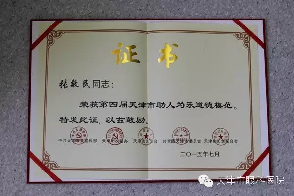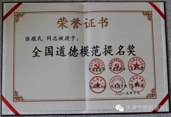10月13日,第五届全国道德模范座谈会和授奖仪式在北京隆重召开,市眼科医院社区服务直通车负责人张敬民同志荣获全国道德模范提名奖,受到中共中央政治局常委、中央文明委主任刘云山等国家领导同志亲切接见。
