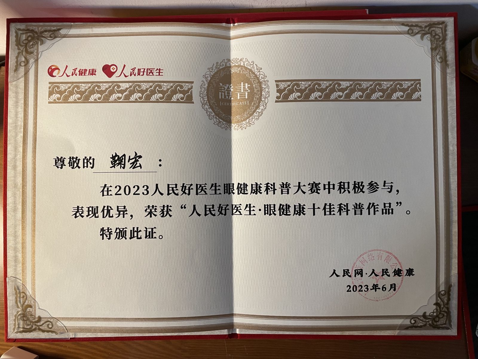 天津市眼科医院获“优秀组织单位”荣誉称号;鞠宏主任获“眼健康科普之星”荣誉称号,作品《战胜青光眼,携手护光明》被评为“十佳科普作品”,我院三个优秀作品入选北部赛区前二十强。