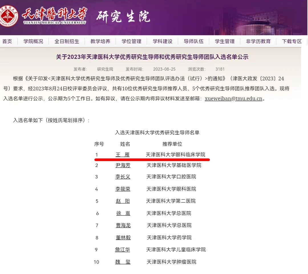 传道授业系国运,秉烛躬耕铸民魂。天津市眼科医院全体同仁坚定不移地贯彻落实习近平总书记在党的二十大报告中提到的“科教兴国”战略,牢记“以教育之力厚植人民幸福之本,以教育之强夯实国家富强之基”,以德立身、以德施教、潜心育人、无私奉献,为推进医院教育工作做出了重要贡献。在过去的一年里,我院在本科生教育、研究生培养、住院医师培训等诸多教学领域中屡创佳绩。在南开大学眼视光医学专业本科教学中,张伟教授主编的《斜视弱视与双眼视觉学》、王雁教授主编的《临床视觉光学》获批南开大学新时代核心课程教材建设工程立项。在刚刚结束的本科生招录工作中,南开大学招录天津考生最高分花落眼视光医学专业。在研究生教育培养中,我院导师队伍进一步壮大,招录博、硕士研究生数量再创新高。近期捷报再传,王雁教授入选2023年天津医科大学优秀研究生导师推荐名单,李轩主任荣获2023年天津医科大学优秀教师称号。在住院医师规范化培训中,我院教师、管理人员、住培学员获得多项天津市优秀奖励。