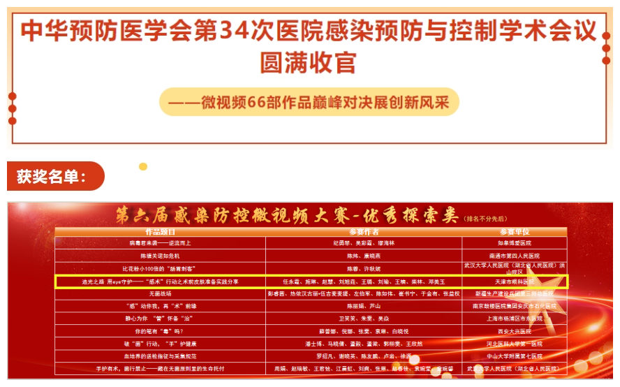 我院感染管理科、护理部、网络信息中心联合制作的微视频作品《追光之路 用eye守护——“感术”行动之术前皮肤准备实践分享》成功入围决赛。