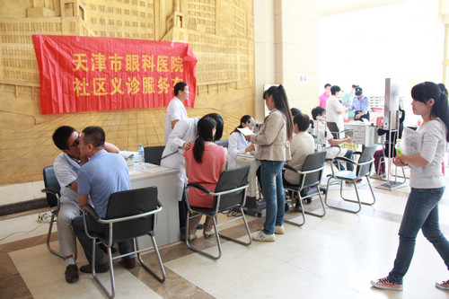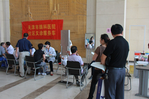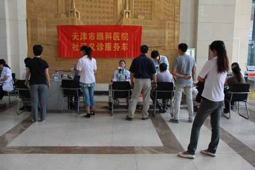 我院直通车与鑫茂集团联系,于2012年9月12、13日来到了天津市鑫茂集团。第一天为当地人员义诊165人,验光110人,修理清洗眼镜35副,发药21支,第二天为当地人员义诊148人,验光98人,修理清洗眼镜26副,发药13支,受到了当地老百姓的热烈欢迎。