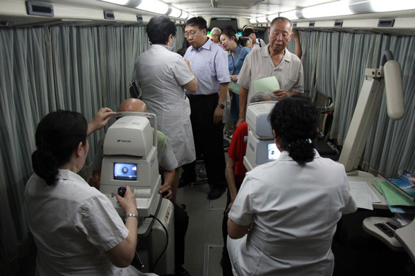 2013年6月28日我院直通车成员在完成白天的义诊咨询服务后,不顾疲劳晚上又在山西省临汾市国税宾馆为老促会、九三学社老干部及其家属义诊。图二、三为直通车内部检查。