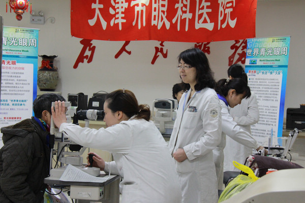 2014.3.12世界青光眼周,天津市眼科医院社区服务直通车来到劝业场街新津里社区为当地居民义诊102人,并发放眼科科普知识宣传材料500余份。