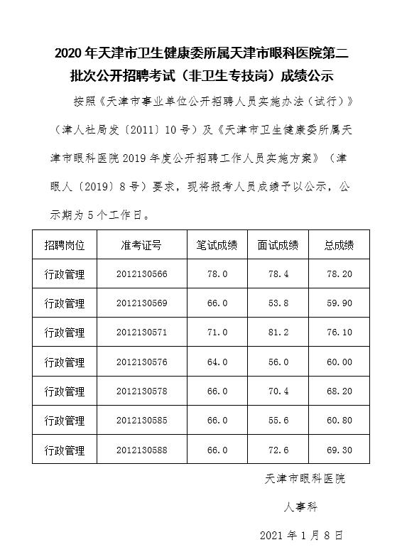 2020年天津市卫生健康委所属天津市眼科医院第二批次公开招聘考试(非卫生专技岗)成绩公示