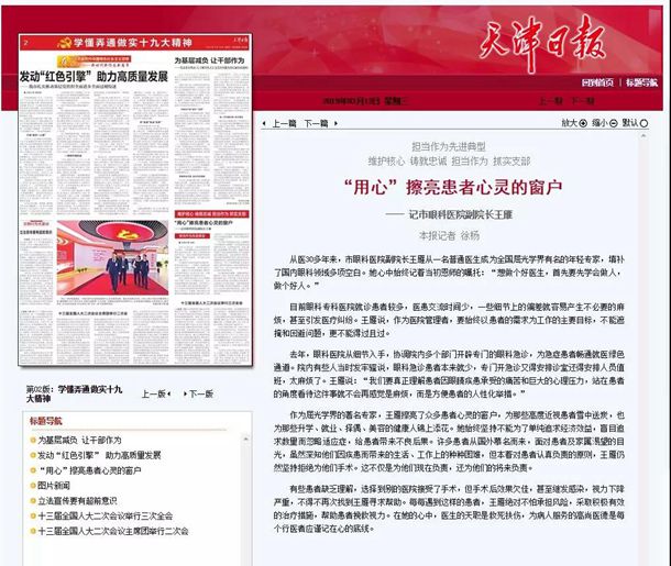 有些患者缺乏理解,选择到别的医院接受了手术,但手术后效果欠佳,甚至继发感染,视力下降严重,不得不再次找到王雁寻求帮助。每每遇到这样的患者,王雁绝对不怕承担风险,采取积极有效的治疗措施,帮助患者挽救视力。在她的心中,医生的天职是救死扶伤,为病人服务的高尚医德是每个行医者应谨记在心的底线。(天津日报,记者 徐杨)
