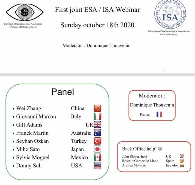北京时间2020年10月18日晚9时(英国夏季时间下午2时),我院斜视与小儿眼科主任张伟教授应邀参加了ESA(欧洲斜视学会)-ISA(国际斜视学会)本年度首场秋季联席会议。本场联席会议由ESA现任主席John Sloper教授和ISA现任主席Rosario Liano教授共同主持,并邀请了包括前国际斜视与小儿眼科理事会主席、现亚太斜视与小儿眼科理事会主席Frank Martin教授,现国际斜视学会副主席、日本斜视学会主席Miho Sato教授在内的国际上享有盛誉的斜视专业8位著名专家学者。