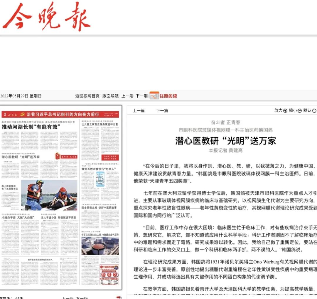 媒体报道 | 《今晚报》专题报道市眼科医院“天津青年五四奖章”获得者韩国鸽