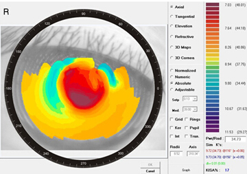 由于近视手术的部位是角膜,通过改变角膜的形态来矫正近视,所以查图的目的是筛查角膜的形态和结构,适合手术的才可以顺利进行。就像地理学上的地形图一样,角膜地形图将角膜的高低起伏通过等高线表示出来,是一种先进的形态学检查手段,需要较高的设备配置。