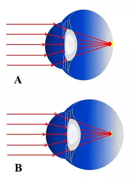 如果眼球在生长发育过程中,眼轴的伸长相对其眼球屈光力过长,光线聚焦于视网膜之前,导致看远模糊,就成为近视。