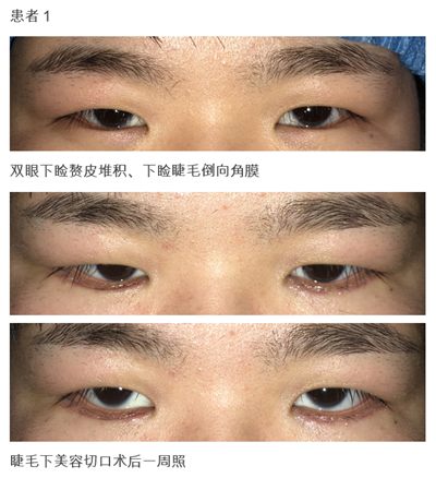 a、缝线法:利用较粗的线穿透全层眼睑使下睑形成轻度外翻状态并保持1周左右拆线,利用外翻线道形成的内部瘢痕抵抗内翻的力量,拆线后不留疤痕,适应于没有过多赘皮或肌肉肥厚的轻度内翻,缺点是作用力较低,容易复发,尤其不适用于内眼角赘皮及肌肉过多过强的患儿。