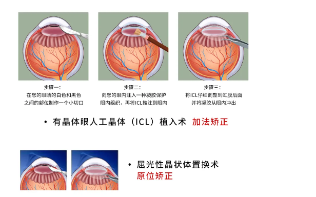 晶体屈光手术包括有晶体眼的人工晶体植入术和晶状体置换术,主要用于超过1000度的高度近视治疗,原理同白内障手术基本类似,在正常晶状体的表面重新植入一枚人工晶体或者将晶状体摘除,替换为人工晶体,通过这个方法可以矫正近视。