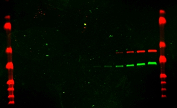 随着我院研究所科研工作的不断深入,在眼科相关疾病分子致病机制研究的基础上基因功能研究已全面展开,在院领导的关怀下相关实验设备也在持续的匹配完善中。2014年新引进的Odyssey Sa红外激光成像系统即全面提升了研究所的蛋白质表达检测实验平台。本设备主要应用于蛋白免疫印迹实验,固态二极管激光光源可实现685nm、800nm双通道激光扫描检测,激光器使用寿命长达2万小时。仪器操作简便,相比于传统的胶片成像方法,避免了暗房操作及复杂的显影、定影过程,待二抗杂交以后可以直接扫描成像。同时,对于蛋白样品的检出线可达皮克(pg)级,完全保证了检测的高灵敏度。应用该设备对蛋白表达情况进行定量评价,是基因功能研究中的必备研究手段,在眼科相关疾病的分子致病机制、基因的表达调控等方面有着重要的应用价值,有助于提升我院科研能力的效率与水平。