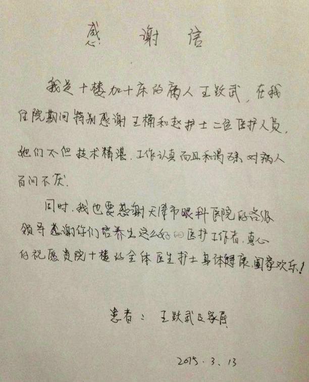 在患者的感谢信中,他对于在院期间得到的细心照料,尤其是十楼全体医护人员的热情帮助表示了感激,并特别对两位年轻护士王楠、赵倩表示了感谢。