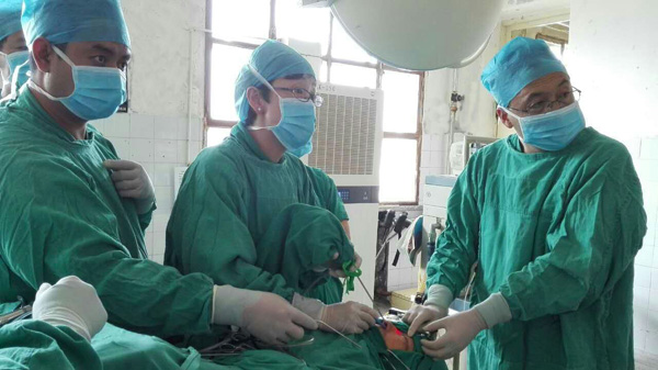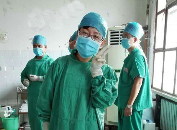 图为我院杨丽红医生成功实施手术后在当地手术室留影