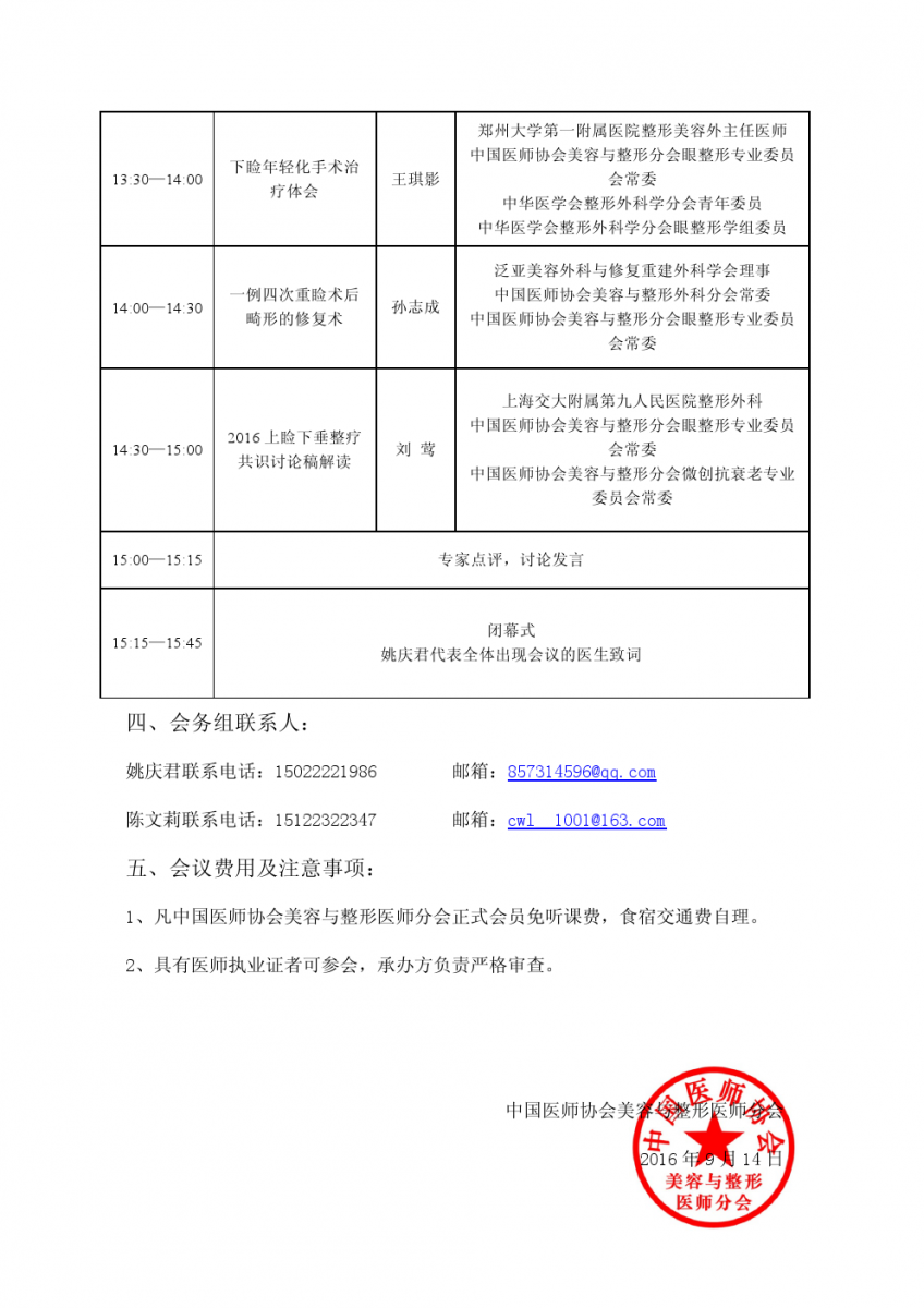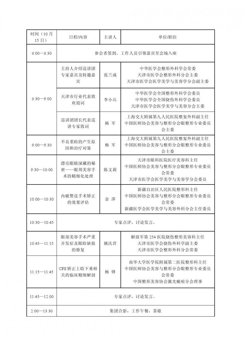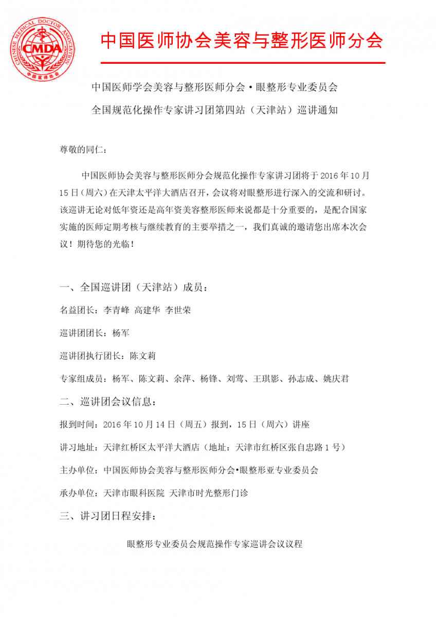中国医师学会美容与整形医师分会•眼整形专业委员会 全国规范化操作专家讲习团第四站(天津站)巡讲通知