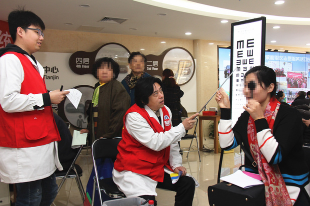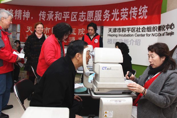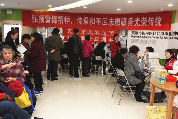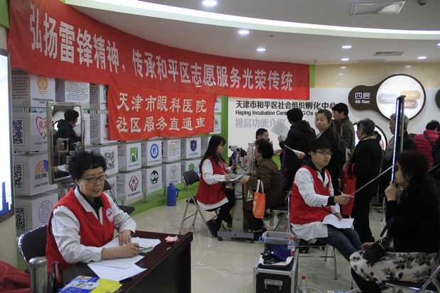 3月17日上午,坐落在荣安街上的和平区社会组织孵化中心热闹非凡,三楼的大会议室正在隆重举行“和平区召开第24届志愿服务表彰大会”;一楼服务大厅则在举行“纪念和平区社区志愿服务活动28周年志愿服务广场活动”,30余个志愿服务展台整齐划一,身着和平区志愿者红坎肩的志愿者们在服务台前热情周到地为群众提供各项服务,市眼科医院社区服务直通车受邀参加此次活动,为前来接受服务的群众们进行眼科义诊咨询服务。