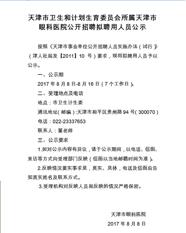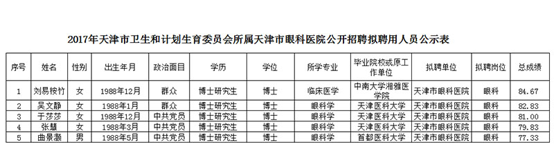 公示:天津市卫生和计划生育委员会所属天津市眼科医院公开招聘拟聘用人员公示