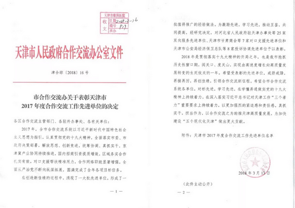 近日,天津市人民政府合作交流办公室发文,表彰了市眼科医院等7家为“2017年度对口支援先进单位”(津合综(2018)16号文件,其中我院是唯一一家医疗单位),肯定了我院在过去一年中全面落实市委、市政府决策部署,解放思想、创新竞进,真抓实干,积极实施精准对口帮扶所创造的佳绩。