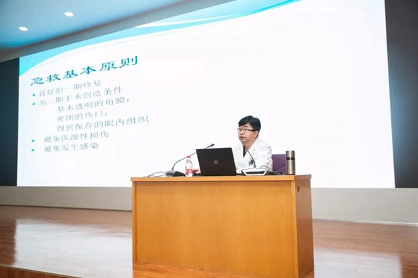 随后,本次讲座主讲人外伤科科主任姜浩,以《开放性眼外伤急救及处理原则》为题,结合急诊手术录像,对常见眼外伤的处理及相关原则进行了细致讲解,并分享了自己多年宝贵的临床经验。