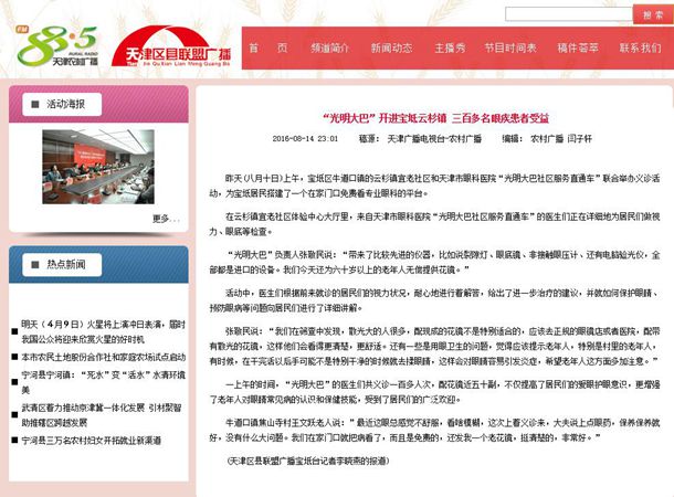2016年8月14日天津广播电视台-农村广播报道“光明大巴”开进宝坻云杉镇 三百多名眼疾患者受益