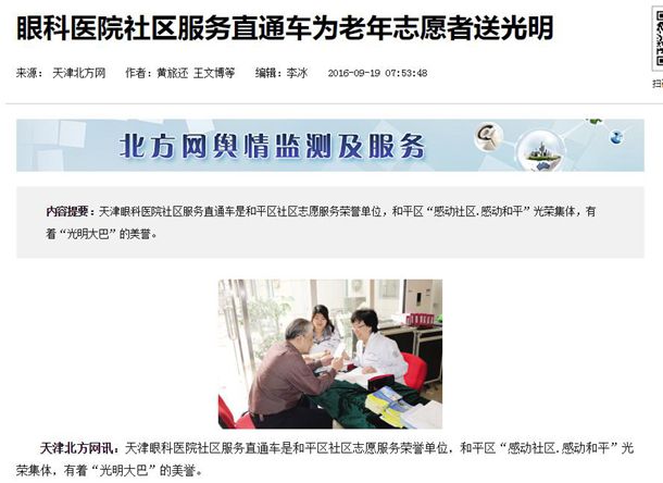 2016年9月19日北方网报道- 眼科医院社区服务直通车为老年志愿者送光明