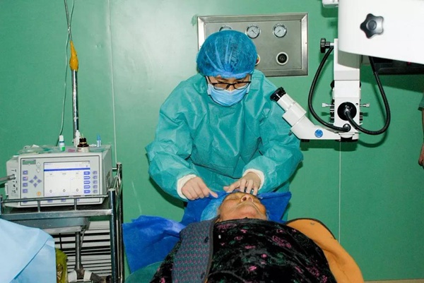 经过短暂的休息,第一天的手术工作开始了。为了能让更多的患者见到光明,我们的队员连工作用餐都安排进了手术休息区,在手术过程中还不忘对身边的医护人员进行带教指导。