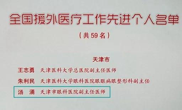 汤涌于2015-2017年经选派参加天津市援刚果(布)第23批医疗队,并于2016年参与完成天津市卫计委承担的中国援助刚果(布)“光明行”项目,在首都布拉柴维尔及黑角与眼科医院援外医疗团队共同完成了复杂白内障超声乳化及小切口囊外摘除手术共计500余例,项目收尾后,继续完成了相关手术40余例。除克服困难完成临床任务外,还参与完成了光明行项目的前期准备工作,包括宣传、物资清关及与大使馆及当地卫生部的沟通协调工作。