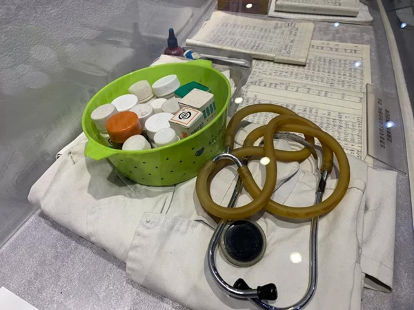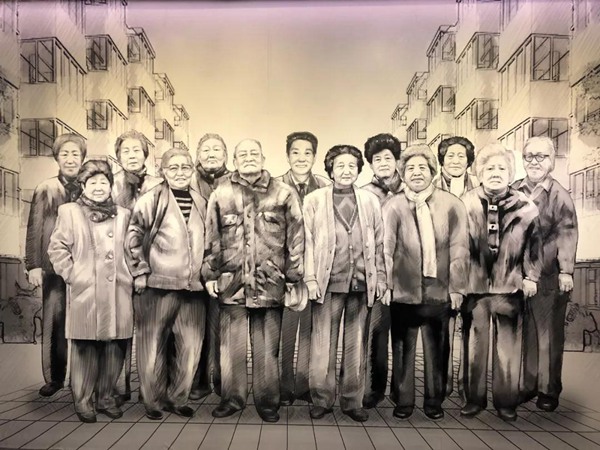 在社区志愿服务展馆中展出的画像。刻画了上世纪八十年代,最初开展志愿服务的13名志愿者。现在,他们都已离世。(央视记者王哈男拍摄)