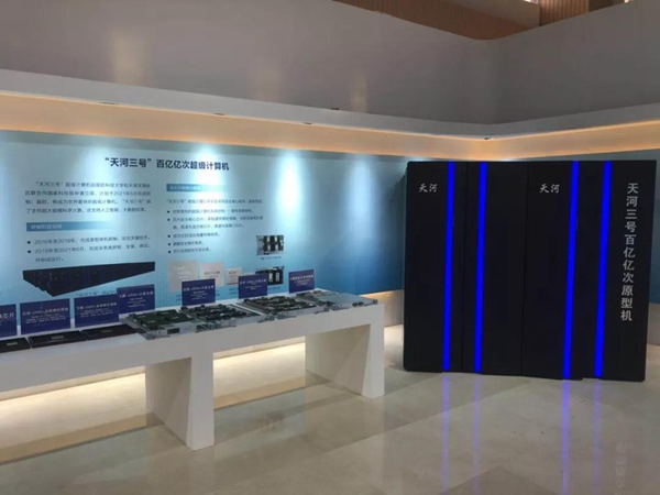 “天河三号”百亿亿次原型机。它由国家超级计算天津中心同国防科技大学联合研制,“天河三号”超级计算机的核心技术全面自主化,原型机系统采用三种国产自主高性能计算和通信芯片。(央视记者王哈男拍摄)