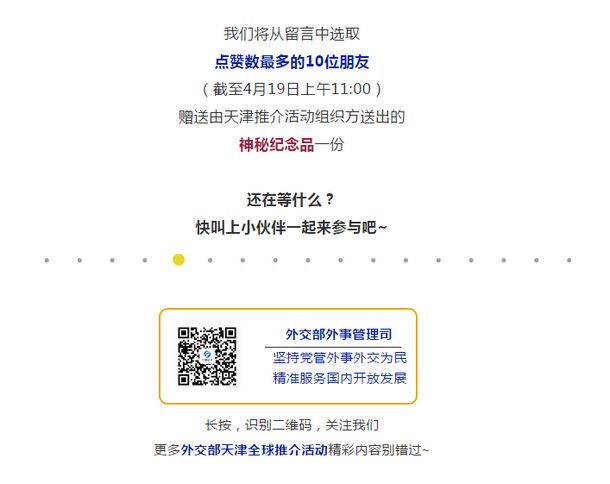 外交部和天津市人民政府将于4月16日(星期二)在外交部南楼举行外交部天津全球推介活动,主题为“新时代的中国:活力天津 走向世界”。届时,国务委员兼外交部长王毅将与中共中央政治局委员、天津市委书记李鸿忠,市长张国清共同出席并分别致辞、讲话和推介,外国驻华使节代表将应邀发言并与来宾互动交流。