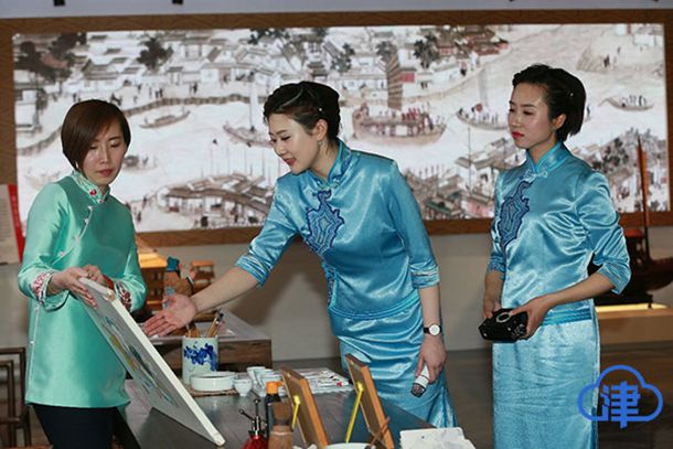 推介现场,讲解员们优雅大气的造型得益于天津美术学院设计人员独特的服装和发饰的造型设计。灵动典雅的蓝色修身旗袍、中式盘发、举手投足间的端庄,无不彰显了天津悠久历史人文的积淀流淌在天津人血液中的优良基因。(津云新闻记者吴宏 摄影马宬)