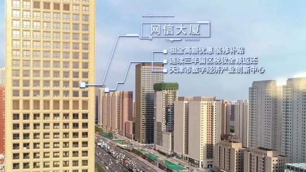 网信大厦选址于河西区新八大里商务区核心区,洪泽路与黑牛城道交口的中冶和悦汇,包含一楼(网信大厦)、一街(和悦汇-互联网+商业e谷)、一园(互联网中央街心公园),总面积约10万平米。其中网信大厦总建筑面积4.8万平米,地上29层,地下2层,作为互联网企业创新创业聚集区;和悦汇商业街5.2万平米,打造成为互联网+商业示范街区“互联网e谷”;项目南侧将建设具备鲜明特点的互联网主题中央街心公园。