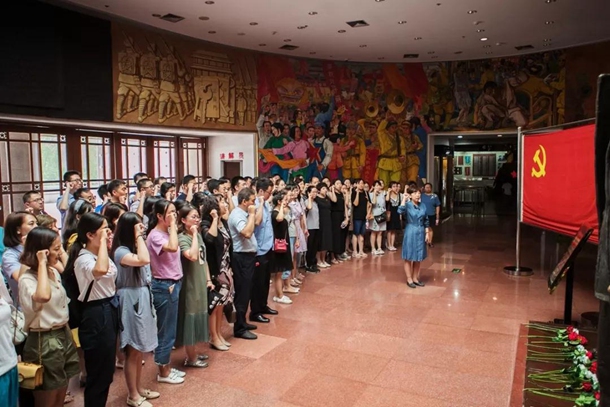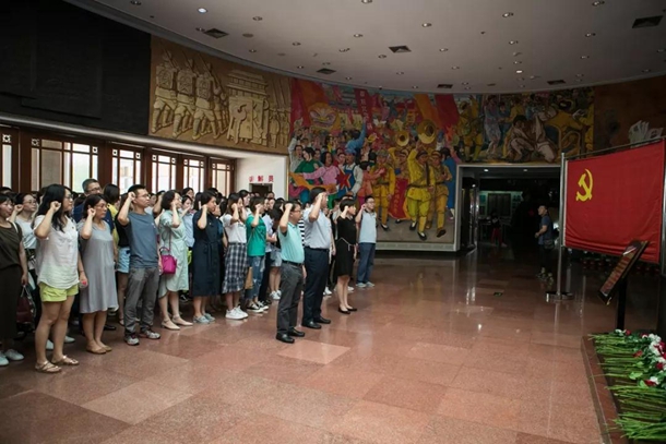 一走进纪念馆大厅,五个伟岸的塑像映入眼帘:毛泽东、朱德、刘少奇、周恩来、任弼时五位老一辈革命领袖正充满信心,气宇轩昂地朝前迈进。全体党员干部肃然起敬,列队注目瞻仰,表达对革命先辈的崇高敬意,并在鲜红的党旗下,重温入党誓词,用铿锵有力的宣誓声表达不忘初心、牢记使命、接续奋斗的信心和决心。