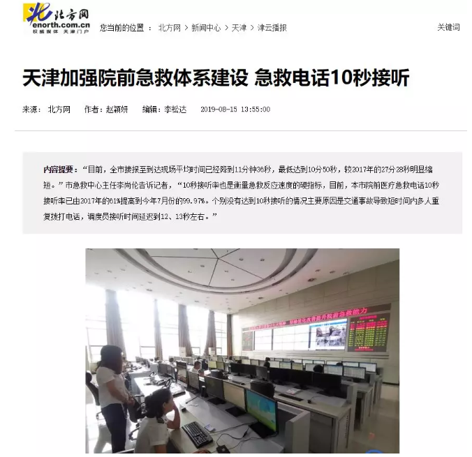 市卫生健康委医政医管处处长刘先夺介绍说,今年我市明确提出急救电话10秒接听率100%、急救反应平均时间2019年降至13分钟以内、2020年降至10分钟以内的目标。目前,我市的院前医疗急救体系建设已初见成效,全市院前医疗急救关键指标明显改善,院前医疗急救体系各项指标已进入全国先进行列。下一步,市卫生健康委将继续加强院前医疗急救体系建设和立法工作,加快有关区急救分中心建设和人员编制、经费保障工作,不断提升院前医疗急救智能化、规范化和精细化管理水平,打造全国120急救“天津模式”。