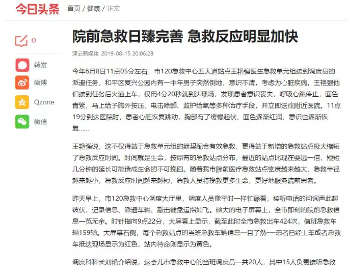 王艳强说,这不仅得益于急救单元组的默契配合有效急救,更得益于新增的急救站点极大缩短了急救反应时间。时间就是生命,按原有的急救站点分布,最近的站点比现在要远一倍,短短几分钟的延长可能造成生命的不可挽回。随着我市院前医疗急救站点密度越来越大,急救半径越来越小,急救反应时间越来越短,急救人员将挽救更多生命,更好地服务院前患者。