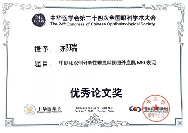 本届大会,在数万计的投稿中评选出42篇优秀论文 ,授予了“优秀论文奖”。我院斜视与小儿眼科一科郝瑞医生,获得此项荣誉。