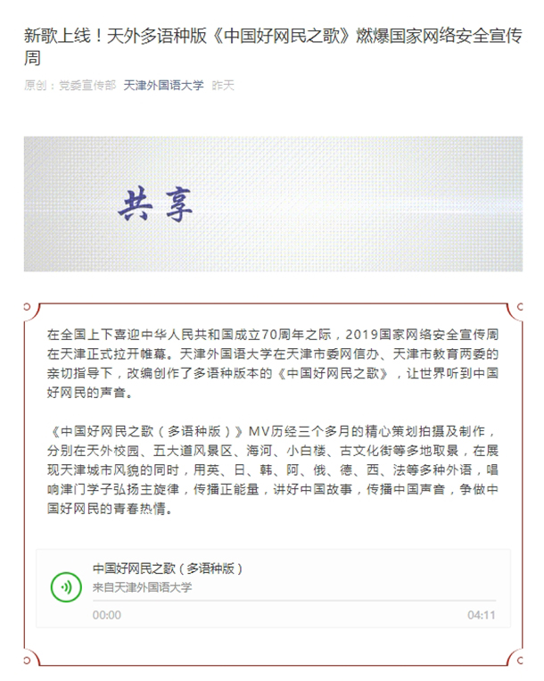 新歌上线!天外多语种版《中国好网民之歌》燃爆国家网络安全宣传周