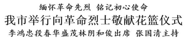 今天上午,市委书记李鸿忠,市委副书记、市长张国清,市人大常委会主任段春华,市政协主席盛茂林,市委副书记阴和俊等市领导同志来到天津市烈士陵园,同我市2000多名各界干部群众一起向革命先烈敬献花篮。张国清主持仪式。