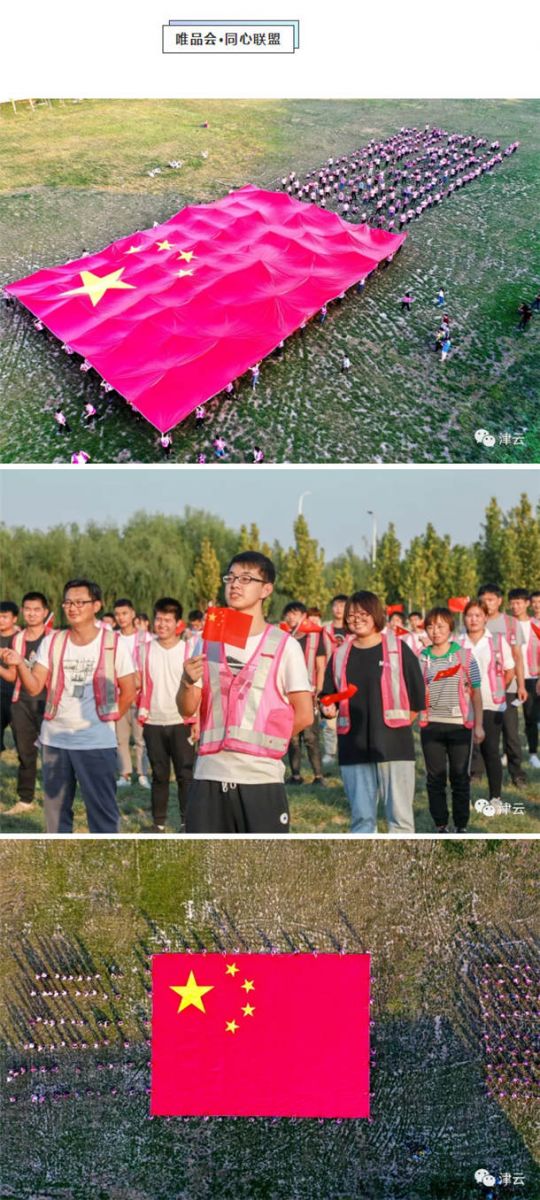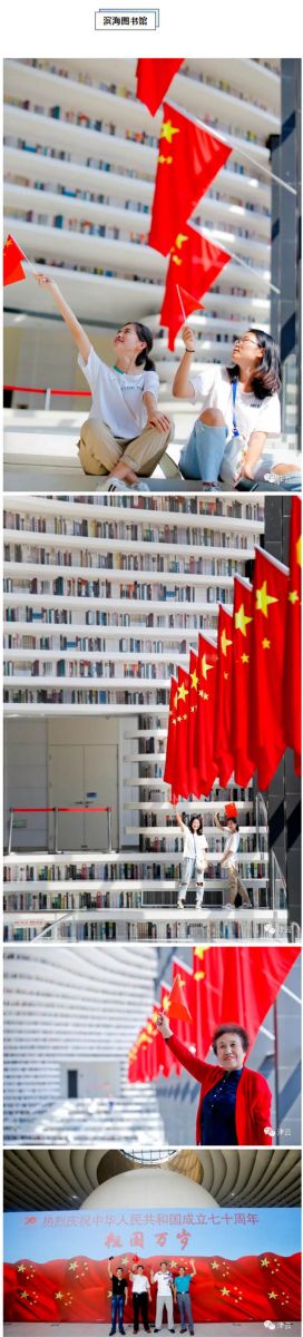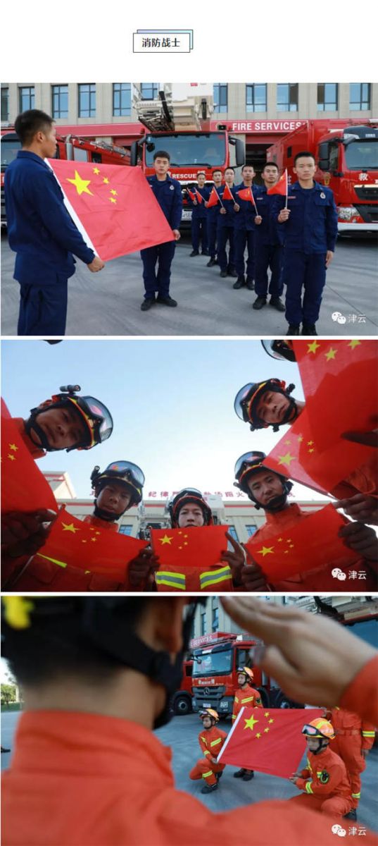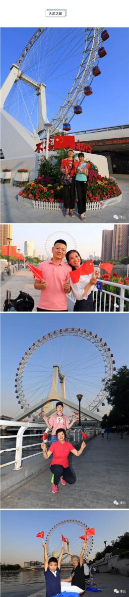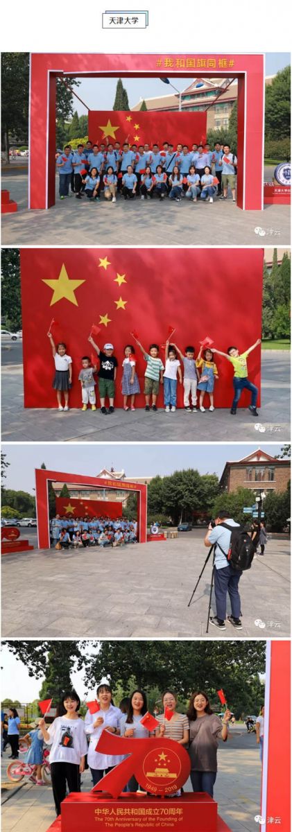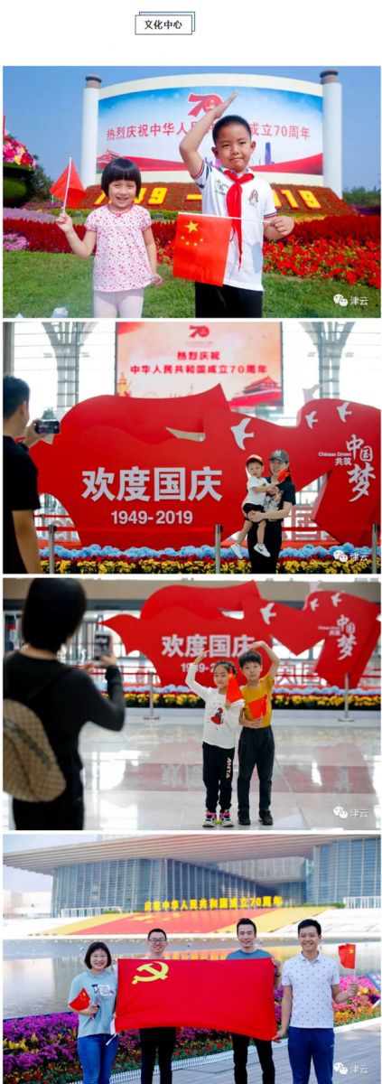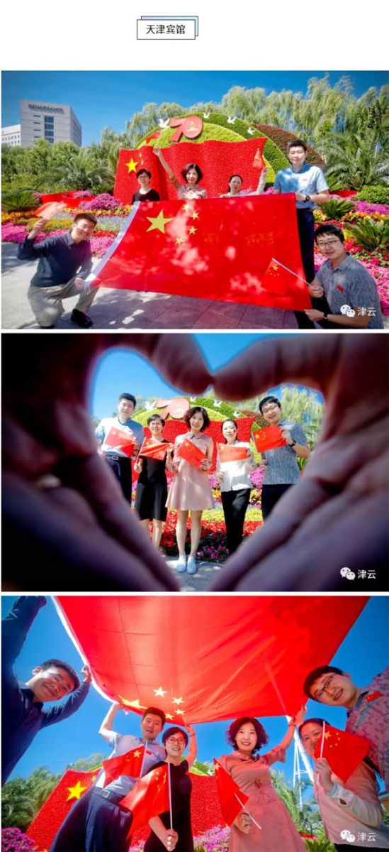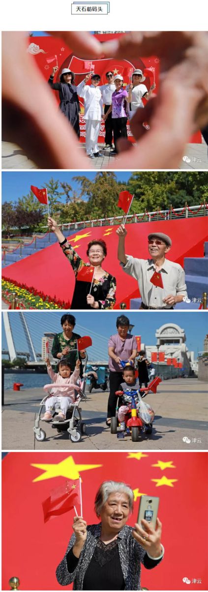 民园体育场、滨海图书馆、天津之眼、文化中心、天津大学、天石舫码头,到处都是手持国旗的市民和游客,他们争相与国旗合影,并在朋友圈里表达着对祖国的生日祝福:“我和国旗同框,我为祖国庆生”、“祝伟大祖国生日快乐”、“做一个中国人,我骄傲,我自豪”、“祝祖国繁荣昌盛、愿人民幸福安康”。