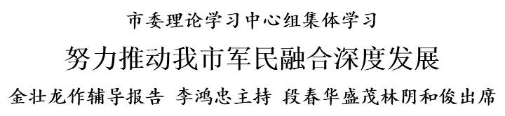本报讯(记者 魏彧 于春沣)今天上午,市委理论学习中心组举行集体学习,深入学习领会习近平总书记关于军民融合发展重要论述,推动我市形成军民融合深度发展格局。中央军民融合发展委员会办公室常务副主任金壮龙作辅导报告,市委书记李鸿忠主持,市人大常委会主任段春华、市政协主席盛茂林、市委副书记阴和俊出席。