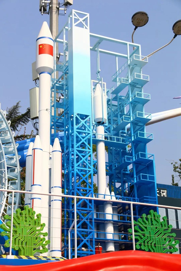“新时代新天津”的彩车上集中了天津港、天河计算机、火箭全箭模态试验振动塔、天津之眼等标志性建筑与高科技产业符号。龙门吊、集装箱元素是北方国际航运核心区的象征。全箭模态试验振动塔、天河计算机是天津智能制造尖端水平的代表。彩车上的绿树被制作成集成电路的形式,既是生态之树,也是科技之树。