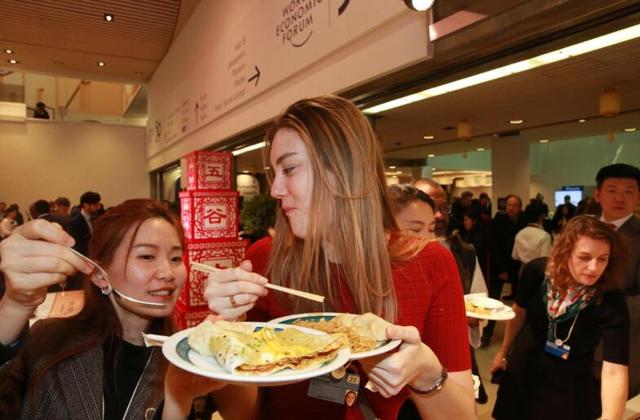 1月22日,在瑞士达沃斯世界经济论坛现场,中外嘉宾们一起品尝天津传统美食。