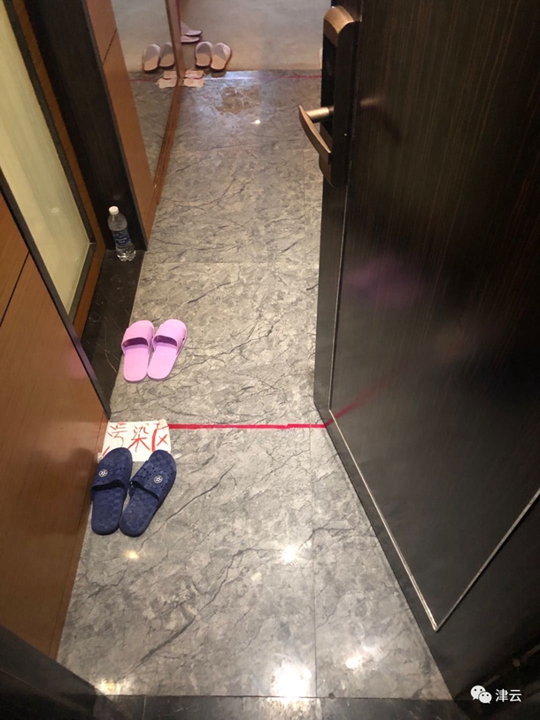 医护人员的每个房间入口处设置成三个区域——污染区、半污染区,清洁区,每个区域都有一双拖鞋,医护人员每次从医院回到酒店,鞋子脱在门外,在污染区换上拖鞋,进入半污染区后,脱掉外套,翻过来挂上,脱掉里面的衣服,洗澡换衣服后进入清洁区。