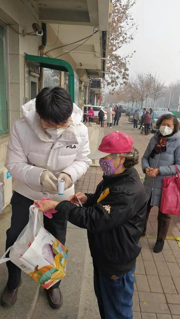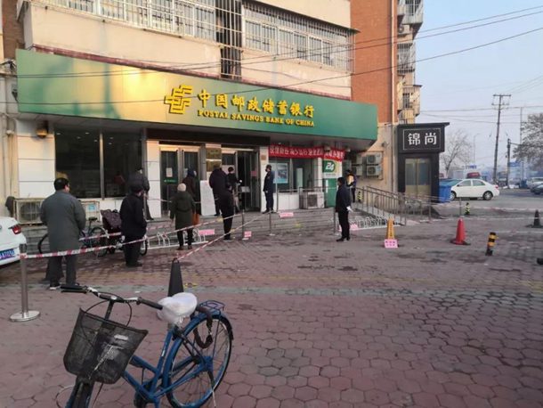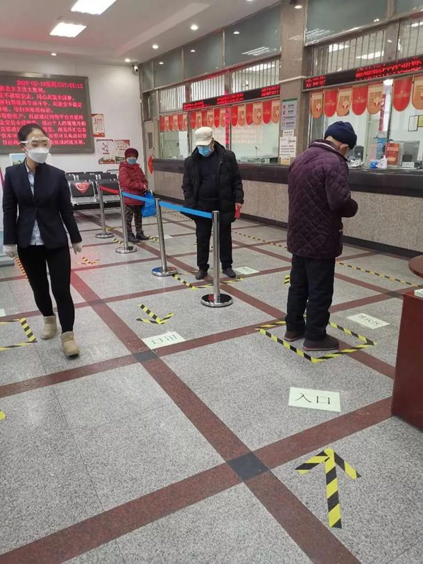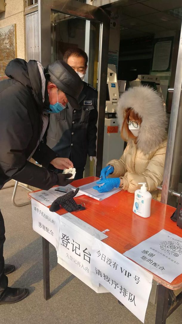 早上8点,银行工作人员开始引导老人们入场,3个人一放,因为营业厅客户区面积只有区区二三十平米,空间有限,为了避免交叉感染。进入网点的客户,在门口都用手机上的“津门战疫”扫码,并在登记台登记、测体温。每一小时,工作人员就赶过来对柜面、密码键盘等接触区进行消毒。