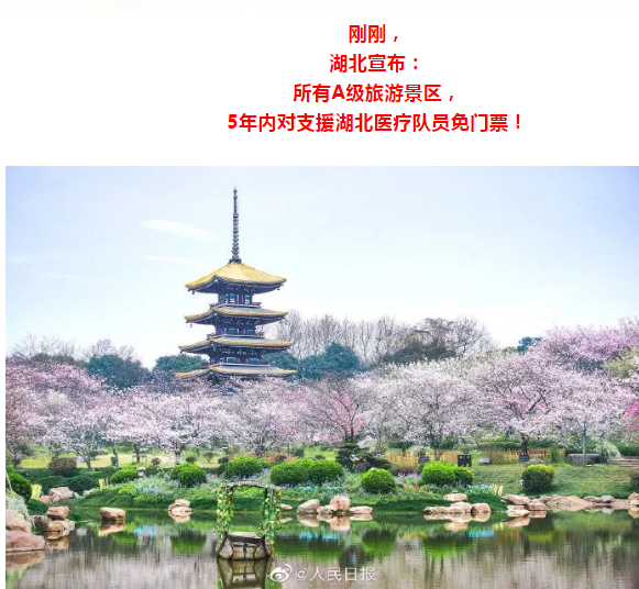 天津日报讯:2月20日,湖北省文化和旅游厅官网发布动态要闻,称湖北所有A级旅游景区5年内对支援湖北医疗队员免门票。