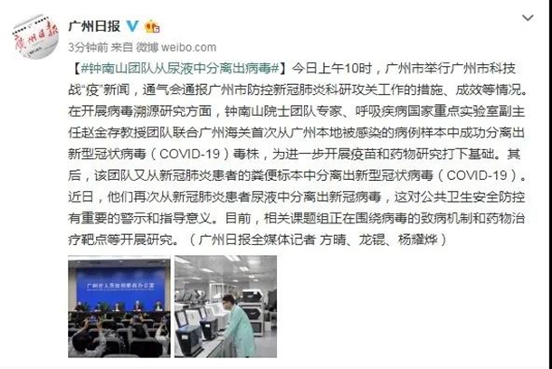 在开展病毒溯源研究方面,钟南山院士团队专家、呼吸疾病国家重点实验室副主任赵金存教授团队联合广州海关首次从广州本地被感染的病例样本中成功分离出新型冠状病毒(COVID-19)毒株,为进一步开展疫苗和药物研究打下基础。