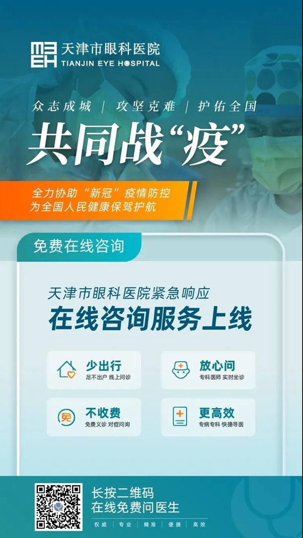 当前,疫情防控牵动着广大群众的心。为了更好地守护百姓眼部健康,方便眼疾患者远程就医,减少到院聚集,降低交叉感染风险,天津市眼科医院于2月10日正式开通了“在线咨询”免费通道,在原有智慧平台建设的基础之上,新增了线上咨询服务入口,防疫特殊时期利用“互联网+”技术推动互联网诊疗服务,将我院具有丰富临床经验的眼科专家,从线下转至线上,让更多眼病患者不出家门就能了解自己的病情,进行科学、有效的处置。