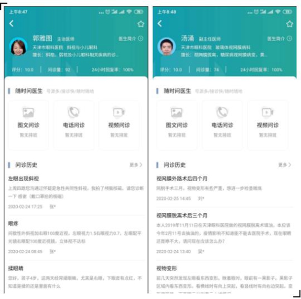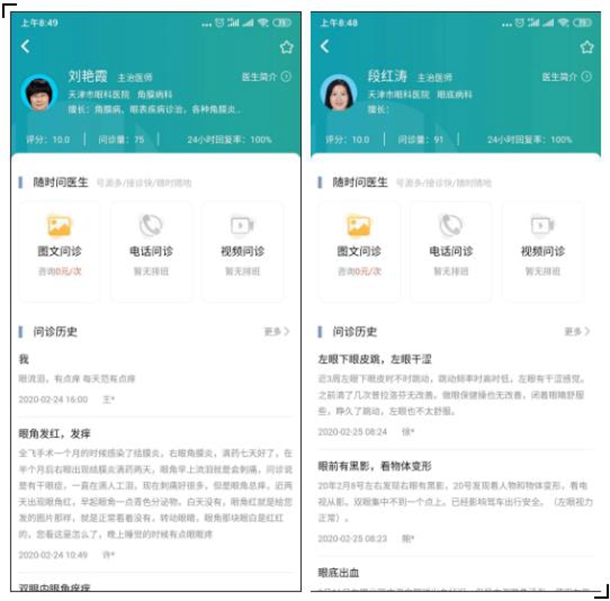 目前,已开通眼外伤科、白内障科、眼眶病眼整形科、青光眼科、视光、斜视与小儿眼科、角膜病科、屈光手术、眼底病科、中医眼科、玻璃体视网膜科、用药咨询共12个科室,76名医生在线服务,疫情期间提供免费咨询服务。自开通在线咨询以来,已经为700余名患者提供了帮助。