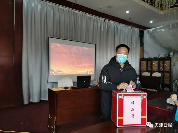 3月4日中午,武汉青山区一家酒店,一场特别的活动正在举行:这是天津第二批支援武汉医疗队队员们在驻地为当地患者进行捐款。